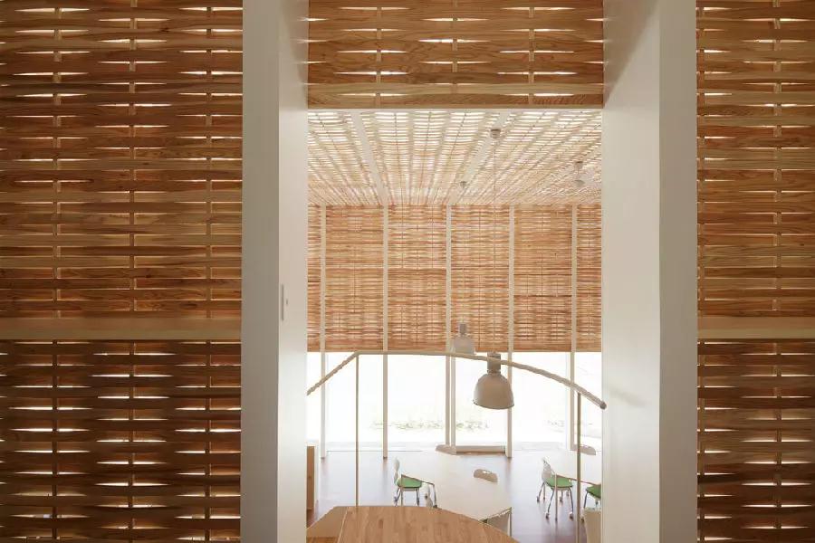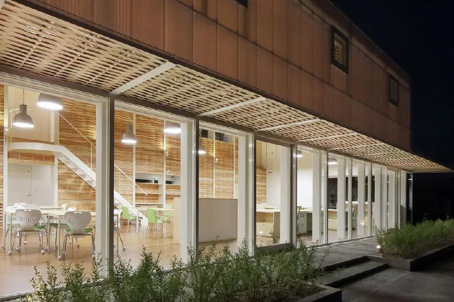 辦公室建筑的墻壁和天花都是玻璃的,內部覆蓋上一層編織如柳框圖樣的木條層,這層材料讓白天的天光變得柔和,人們不需要開燈就能辦公;這層材料也使辦公室不至于過熱,減少對空調的依賴。