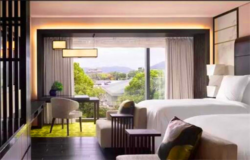 京都四季酒店共有110間客房,客房內(nèi)洋溢著寧靜私密的氛圍,設計上體現(xiàn)出傳統(tǒng)和室的特色。日光在簡譜的木地板上投下鮮明的影子,屏風上也繪著當?shù)厮囆g家的作品。還有以明亮的紫色為主調(diào),采用天然橡木地板的客房設計,盡顯皇室風范。多數(shù)房間可以擁有日本庭院的室外風景,陽光穿透樹枝從落地窗灑進房內(nèi),水光粼粼的庭院更一覽無遺。HBA新加坡設計團隊還巧妙地將池泉園、妙法寺及周邊的美景納入房間窗景中。透過窗戶便是一副四季如畫的風景線。