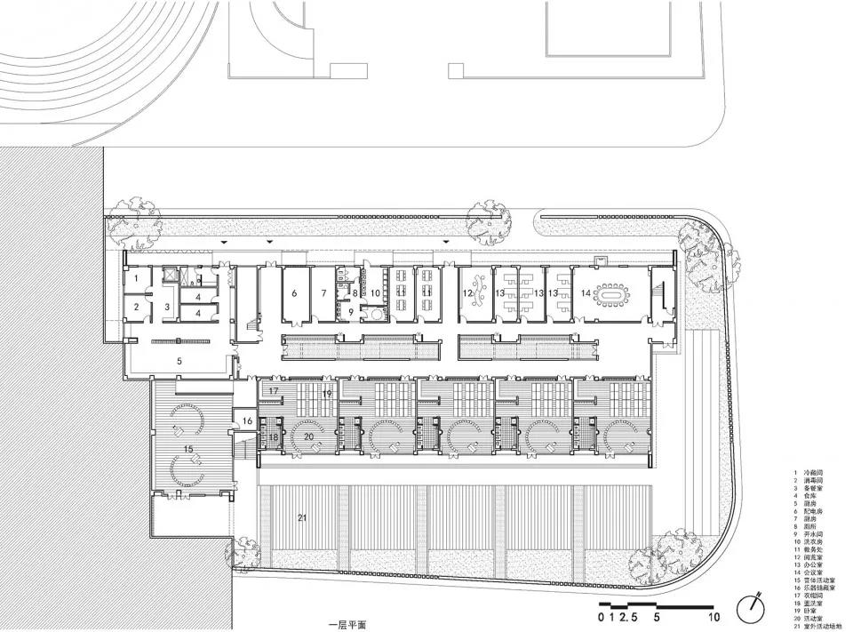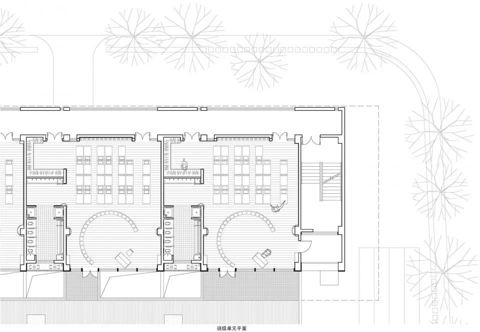 建筑中間的內(nèi)院使一層北側(cè)行政和服務(wù)空間也可得到足夠的采光。在景觀方面,每個(gè)班級(jí)都有對(duì)應(yīng)的綠地供幼兒活動(dòng)。