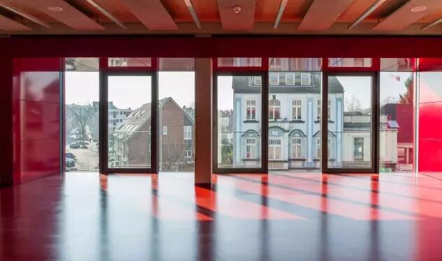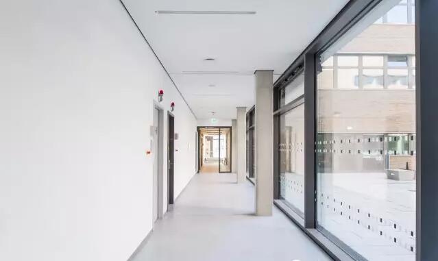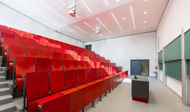 階梯教室中心的大堂一面朝向校園另一面朝向杜伊斯堡大街,既通向西面的有軌電車又與北面的食堂相通。兩條有代表性的逃生樓道直通上層的教研室和階梯教室。該設(shè)計(jì)正是采用了Rochade理論。由圖書(shū)館而產(chǎn)生的結(jié)構(gòu)可實(shí)現(xiàn)多樣化的可變使用風(fēng)格,充分利空間,將該區(qū)域劃分為兩層,在滿足空間需求的前提下也提供了最佳的層高。