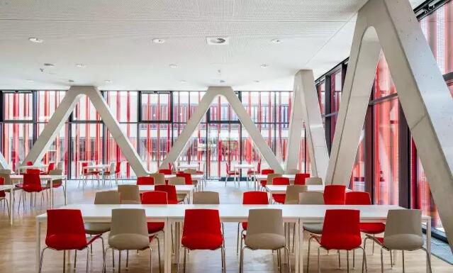 食堂一樓的大堂內(nèi)設(shè)有咖啡廳,教研室,供學(xué)生使用的學(xué)習(xí)室以及配送,倉(cāng)儲(chǔ)和設(shè)備區(qū)域。穿過(guò)寬大的樓梯來(lái)到位于上層與廚房相連的就餐大廳。一個(gè)開(kāi)闊的突出部份和兩條樓梯將整個(gè)大廳分割成幾塊。既給食堂的下層提供了充足的照明又減輕了重量,彰顯校園和食堂的獨(dú)特風(fēng)格。