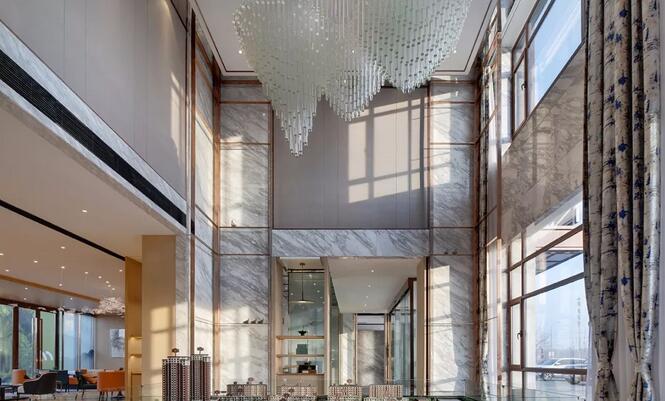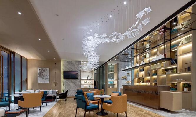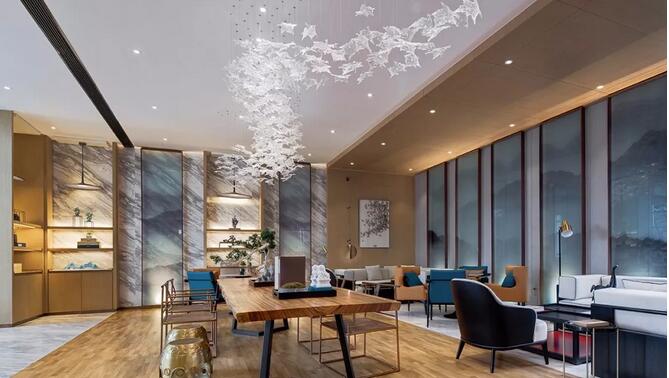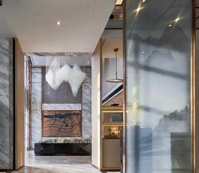 “夫畫道之中,水墨最為上。肇自然之性,成造化之功?!钡袼堋澳琛币詾V盡色彩剔透琉璃為墨,飽蘸筆觸,起承轉合,縱橫貫穿于洽談區(qū),成了空間最純粹的風景。