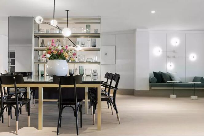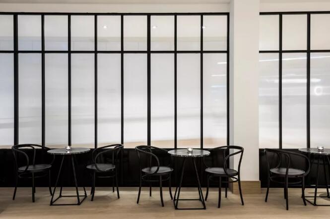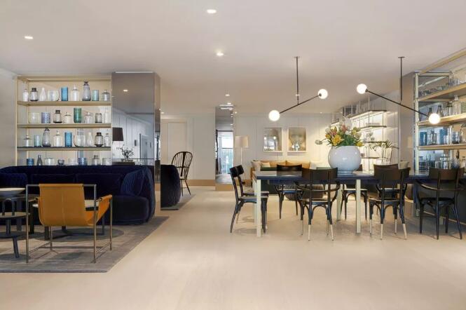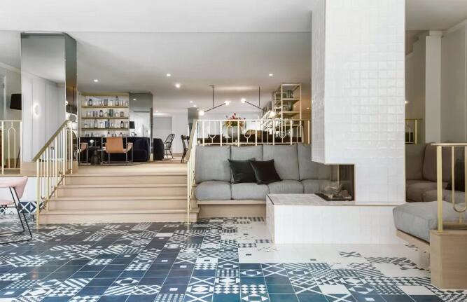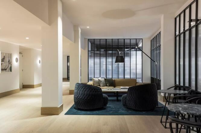 客廳隱藏在酒店的中心,位于House酒吧旁邊。這一清新而優(yōu)雅的空間包含一個(gè)外部庭院,由通高的鋼架玻璃墻圍合起來(lái),其中布置著各式各樣的植物、垂花吊燈和秋千椅??蛷d內(nèi)部的地面呈對(duì)角鋪設(shè)著淺色的橡木板,當(dāng)中穿插著一些光滑的方形混凝土磚。室外的庭院同樣延續(xù)了這一圖案,由混凝土和黑色的砂礫鋪成。在夏天,庭院可將光線(xiàn)和新鮮空氣引入室內(nèi),成為在陽(yáng)光中小酌一杯的完美聚會(huì)空間。