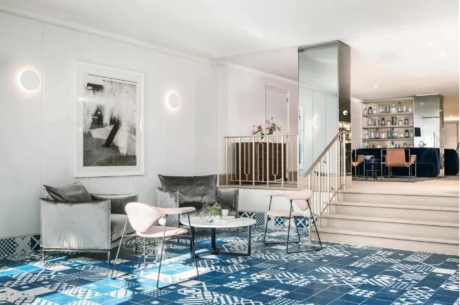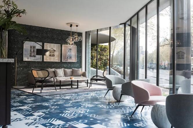 客人們首先經(jīng)由弧形頂棚下方的白色水磨石樓梯到達(dá)酒店入口。設(shè)計(jì)大膽的定制綠色水磨石墻壁定義出入口區(qū)域,種滿(mǎn)植物的立面為之增添了柔和的質(zhì)感。植物中間還鑲嵌著一串粉色的霓虹燈字:“呼吸”。建筑師為酒店接待處設(shè)計(jì)了一款帶有圖案的藍(lán)白色琉璃地磚,其設(shè)計(jì)靈感來(lái)源于荷蘭傳統(tǒng)的代夫特陶器。接待臺(tái)后方,鋪設(shè)著白色瓷磚的壁爐邊環(huán)繞著一排軟墊沙發(fā),搭配抱枕和地毯,帶來(lái)閱讀和放松的空間。一系列精心挑選出來(lái)的當(dāng)代藝術(shù)品和特色燈具,共同為四周的墻壁帶來(lái)活力。