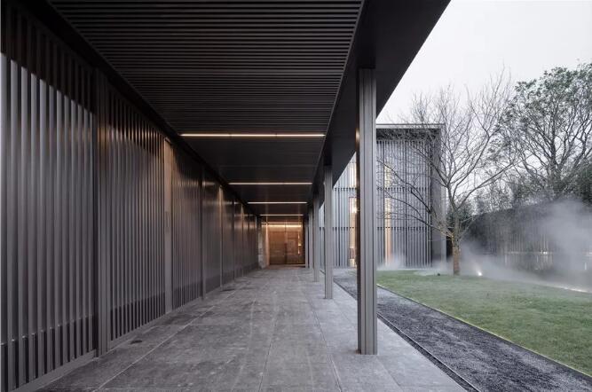 此次改造的重點,一是入口,二是內(nèi)部平面功能的重新設(shè)定。樸悅希望整個銷售中心的改造能與外界形成一種反差,以不同的場景營造形成有趣的體驗。整個售樓處鬧中取靜,幽靜的內(nèi)院獨享一片城市的寧靜。基于這個優(yōu)勢,設(shè)計師將原正面入口移至左側(cè),并在內(nèi)庭改建了一處廊道,以序列感排列的木格柵構(gòu)建,溫暖靜謐、平靜中帶來舒緩的節(jié)奏,以此形成步入的初始印象。