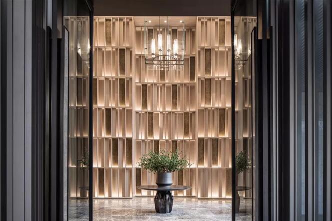 推門進入,首先步入眼簾的是前廳。淺木色木質(zhì)格柵自上而下充斥整個8米層高空間,建筑元素織就的前廳展現(xiàn)了自然的親切和溫暖,加之兩側(cè)與頂燈的渲染,與外部形成了視覺上的差異,令人震撼。肅然進入,行至位于對立面凹檻處的接待臺,半遮掩狀態(tài)的圓形導(dǎo)臺被裹挾式藏以身后,僅以灰色墻紙和深色大理石裝飾,藏而不露更添幾分神秘。