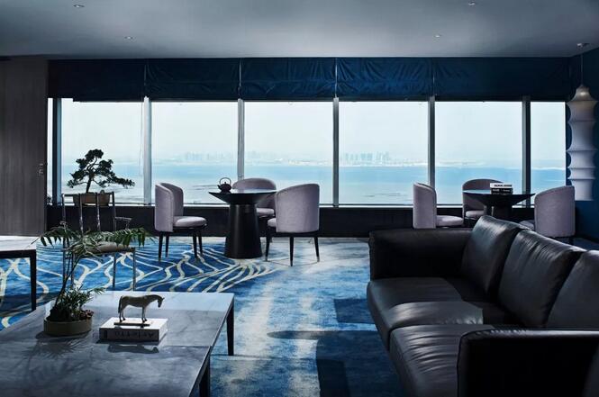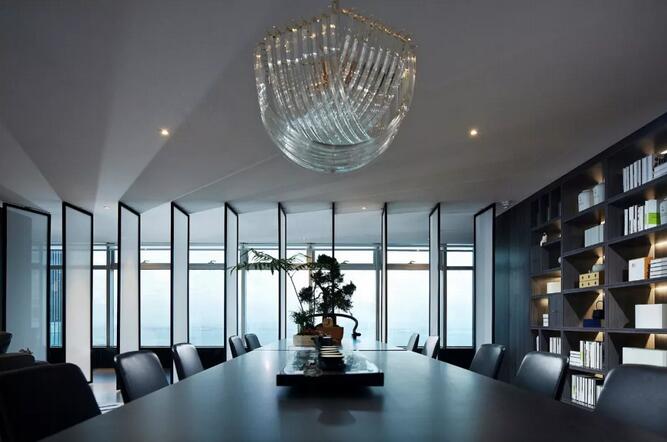休閑區(qū)內(nèi),一株松柏透出骨子里濃濃的文人趣味,屏風之后又是海納百川的廣闊胸懷??臻g中的新中式書架以及皮質(zhì)沙發(fā)通常服務(wù)于成功男性,設(shè)計師將傳統(tǒng)交椅的小尺度改為大比例,為舒適加分,觀賞海景的同時帶來君臨天下的會談體驗。