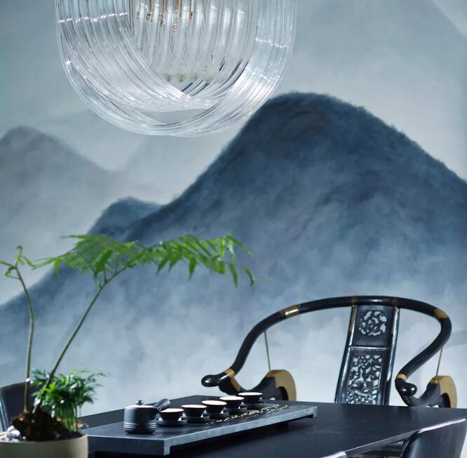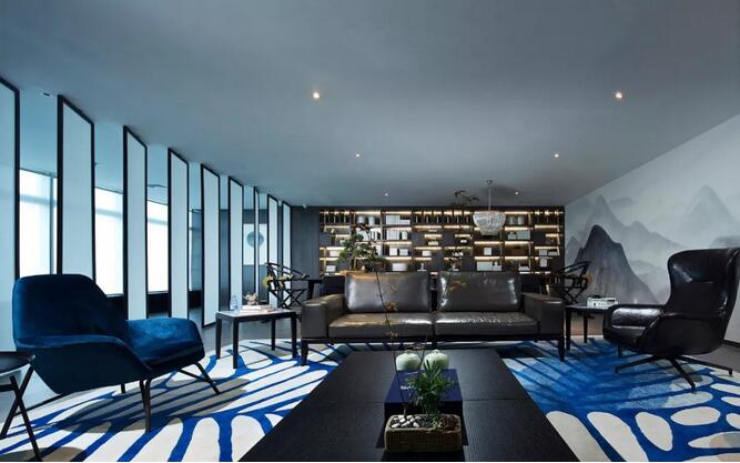 中式元素跟摩登的這種碰撞很奇妙,你可能會覺得這兩個風格不想(相)干,但是在兩位設(shè)計師看來卻是十分和諧。簡潔大氣的設(shè)計框架中點綴中國古典山水之意蘊。休閑區(qū)沙發(fā)上的藍色絲絨,仿佛也是空間故事的起承轉(zhuǎn)合。