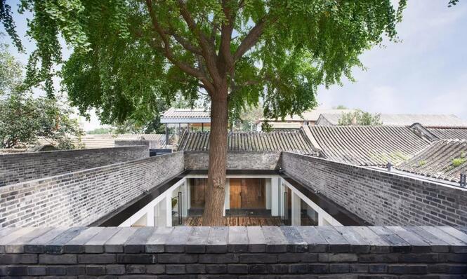 院子是“四合院”建筑的居住樂(lè)趣所在。順著廊道來(lái)到后院,東側(cè)角落坐落著一處被青磚包圍的景觀空間。穿過(guò)后院,通過(guò)南側(cè)樓梯上到二層。二層的露臺(tái)由一層廊道屋頂連通而成,形成坐于屋瓦之間、樹(shù)蔭之下的典型北京胡同文化體驗(yàn):夏聽(tīng)蟬鳴,冬看白雪黛瓦。