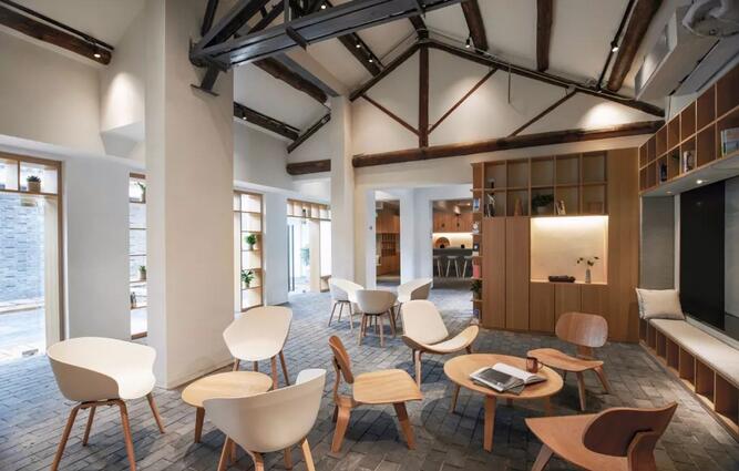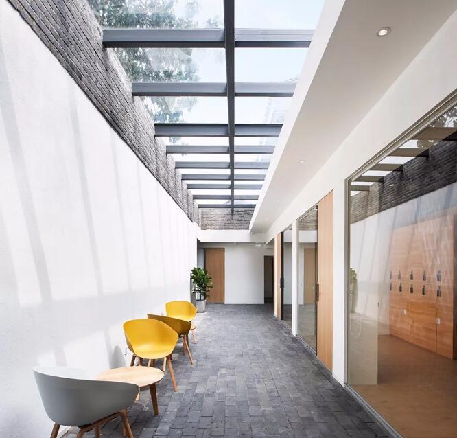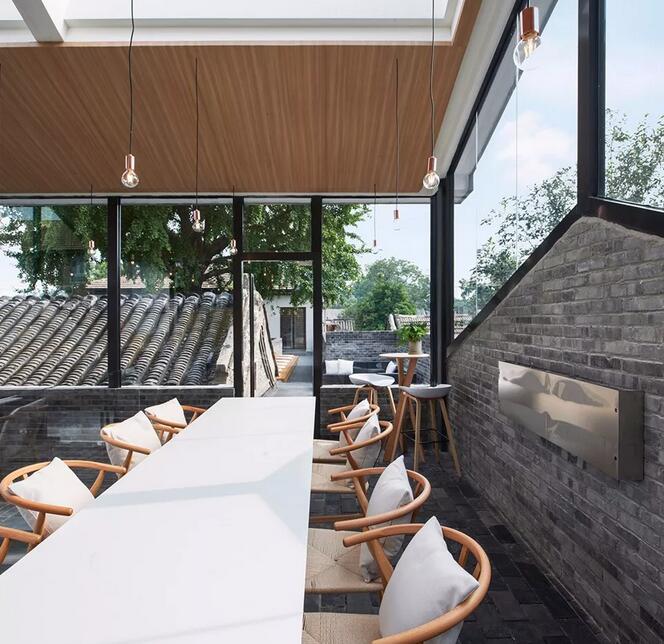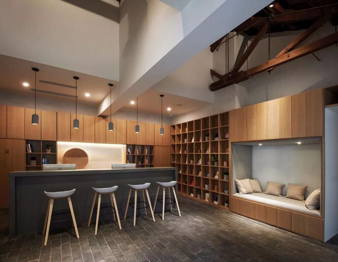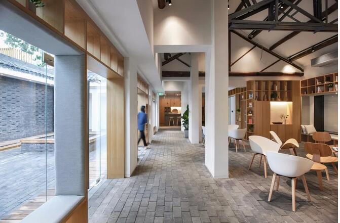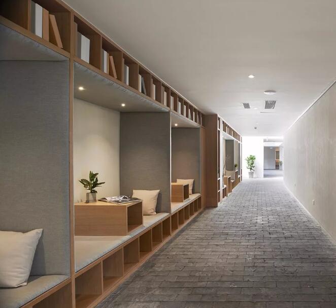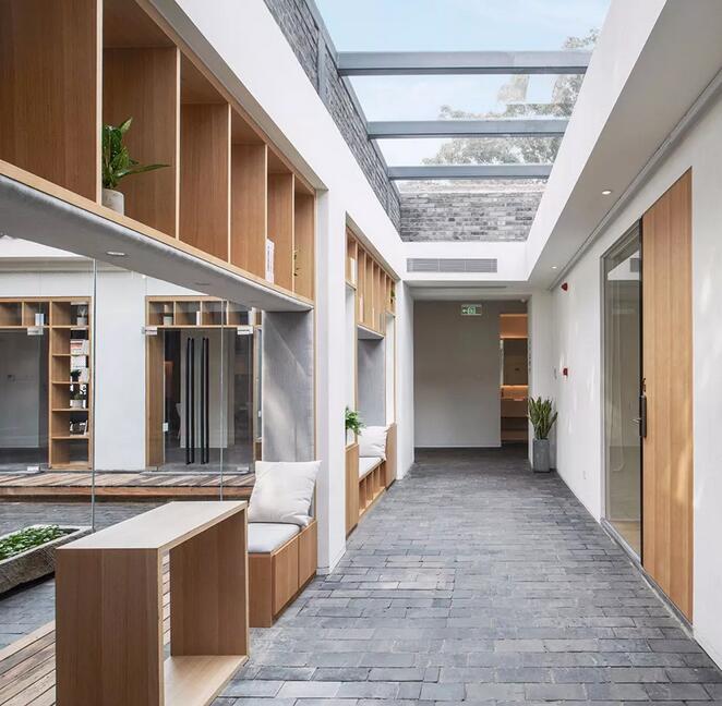 前院東側(cè)通道為可供休憩的共享廊道空間,這條公共走廊使城市和胡同的街道得以延長(zhǎng),形成“半戶外街道”式的全新空間,灰磚與公共家具既成為連接著過(guò)去的橋梁,也將膠囊空間變成一個(gè)真正的“家”。整條廊道貫穿前、后院,利用落地窗,隔而不斷,框取庭院風(fēng)光。游走長(zhǎng)廊時(shí)仿若置身悠長(zhǎng)的胡同,原本陌生的游客、住客、鄰里不自覺(jué)停駐于此邂逅交流。更能以具有流動(dòng)性的書本為媒介,通過(guò)公共家具的引導(dǎo)帶來(lái)別具趣味的“交流”。