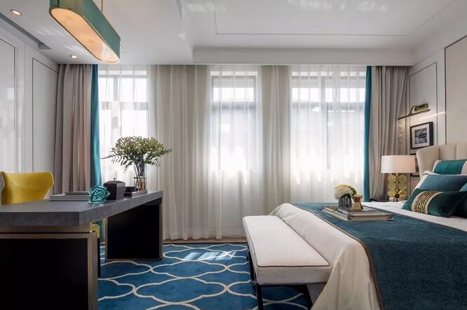 經(jīng)典的黑白配在軟裝布藝和皮革上盡情演繹,加以明快的孔雀藍(lán)及黃色花色和飾品做點(diǎn)綴,使整個(gè)空間層次豐富,個(gè)性鮮明。
