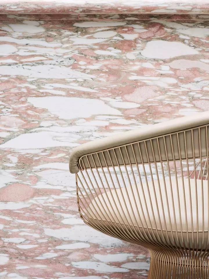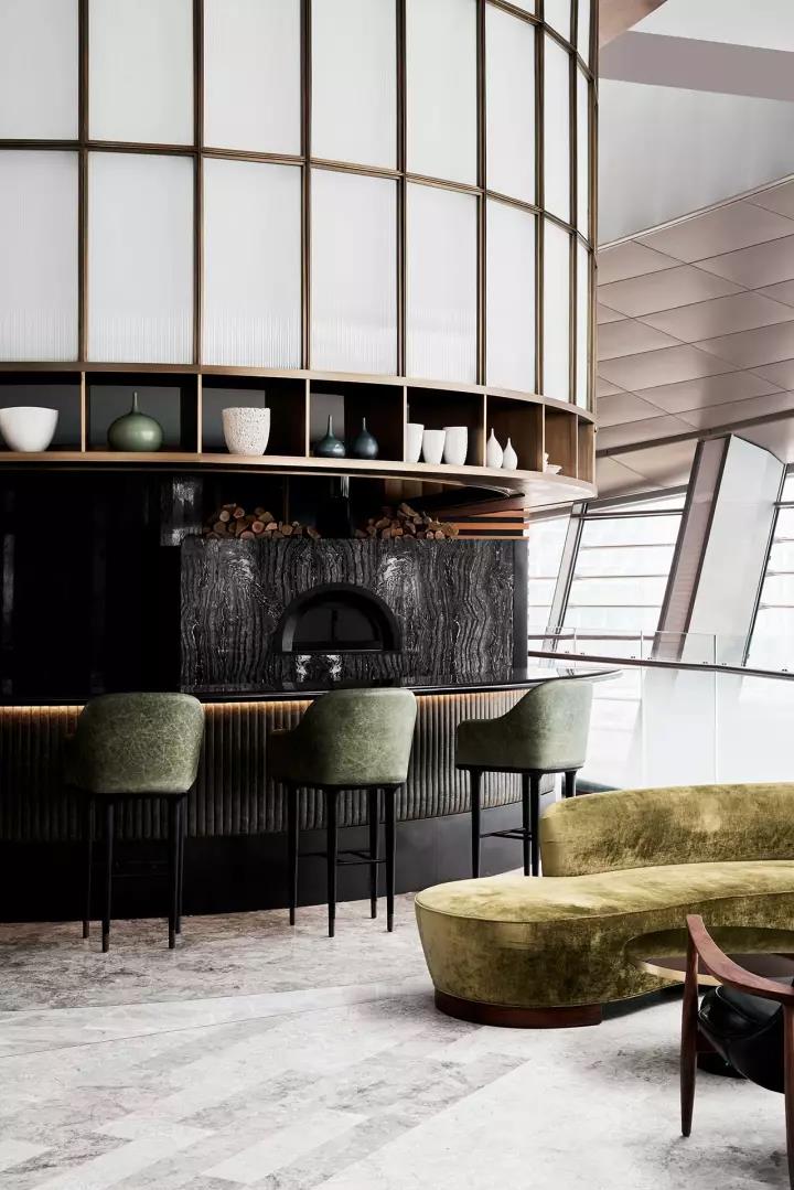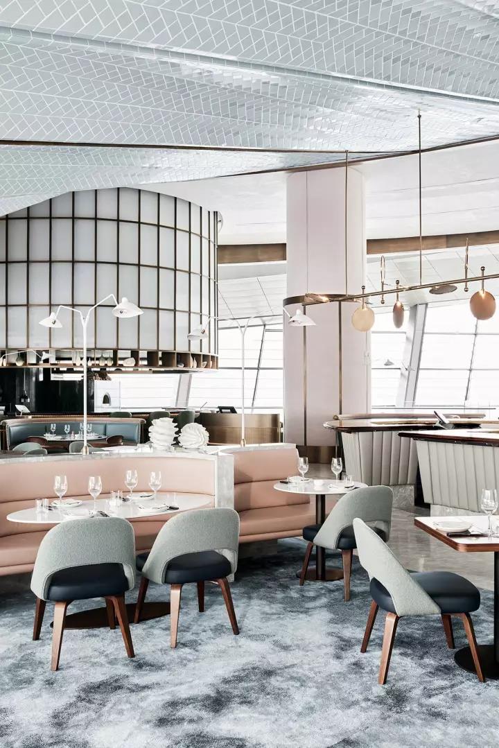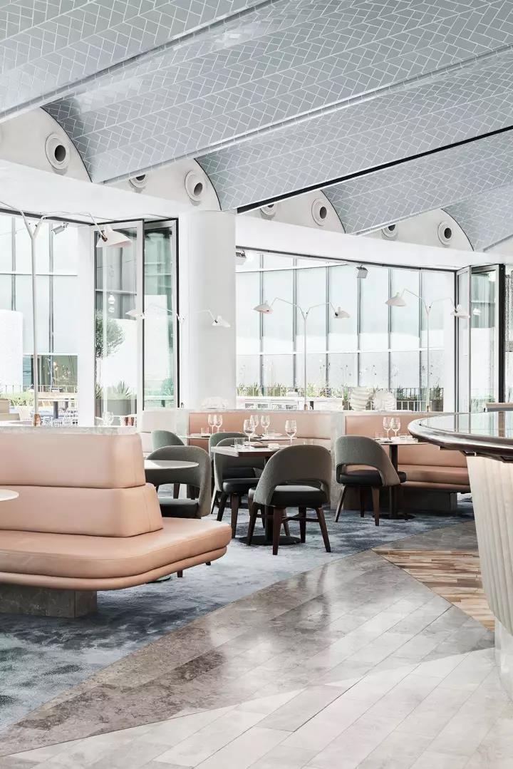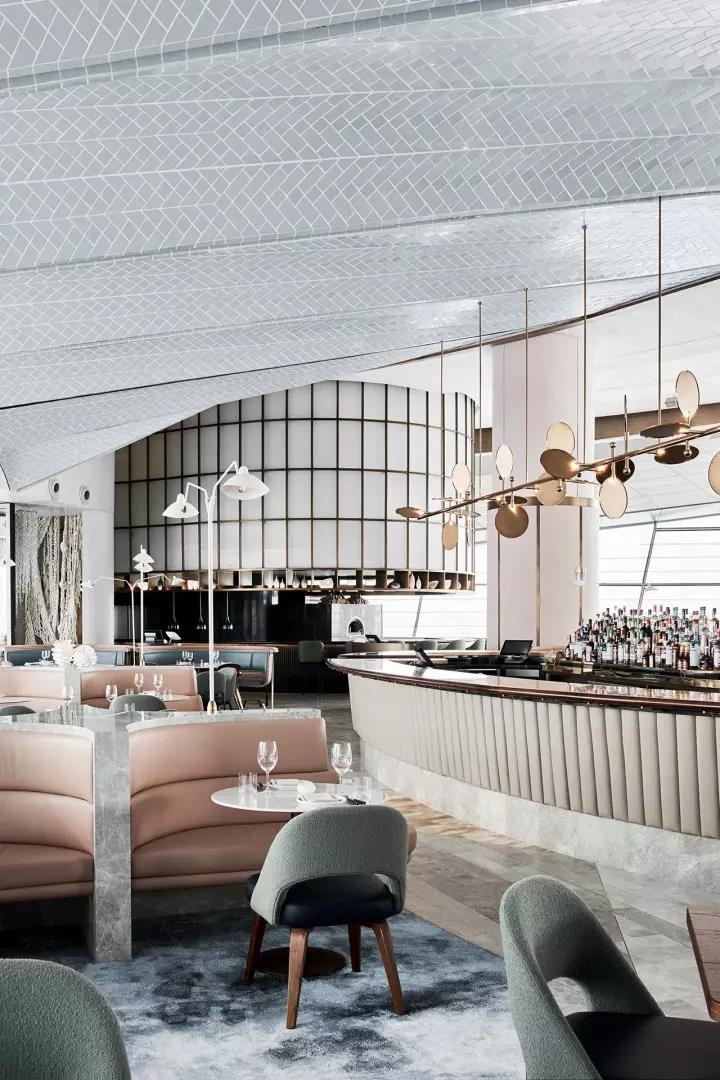 餐廳的設(shè)計(jì)從迪拜歌劇院和主廚對(duì)生蠔的熱愛(ài)中獲取靈感。在主餐廳里,一種粉色和奶油色的皮革和淺灰色的大理石色調(diào),類似生蠔內(nèi)部,而外圍則有一系列深色的灰色、綠色和黑色的色調(diào),讓人想起生蠔殼風(fēng)化紋理。貼著瓷磚的拱形天花板類似海上的波浪,加強(qiáng)了海洋主題的設(shè)計(jì)理念,手工制作的藍(lán)色羊毛地毯,是Alexander & Co特別設(shè)計(jì)來(lái)模擬海洋水域。