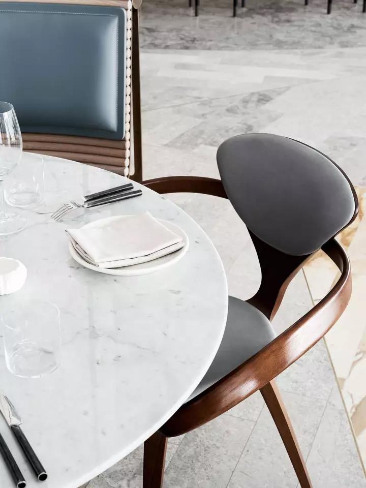 布藝部分使用綠色、灰色、藍(lán)色和白色的皮革面料傳遞強(qiáng)烈的海洋氣息,搭配中世紀(jì)天然的胡桃木家具,Serge Mouille的蜘蛛臂落地?zé)?。使整個(gè)餐廳猶如一顆珍珠般璀璨耀眼。