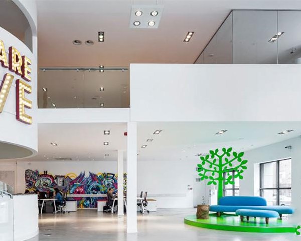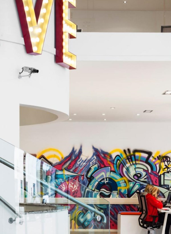 該辦公空間展示出了無限的創(chuàng)造力,從接待處旁邊看,懸掛在彎曲的臺(tái)階墻上的“我們都在線”的標(biāo)語到使辦公室變得活躍的涂鴉墻,每個(gè)元素都是精心挑選,可以增強(qiáng)品牌的意識(shí),提升整體的創(chuàng)造力水平。