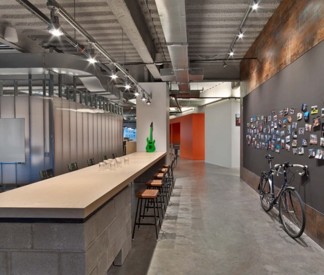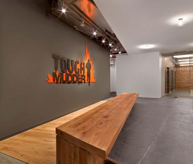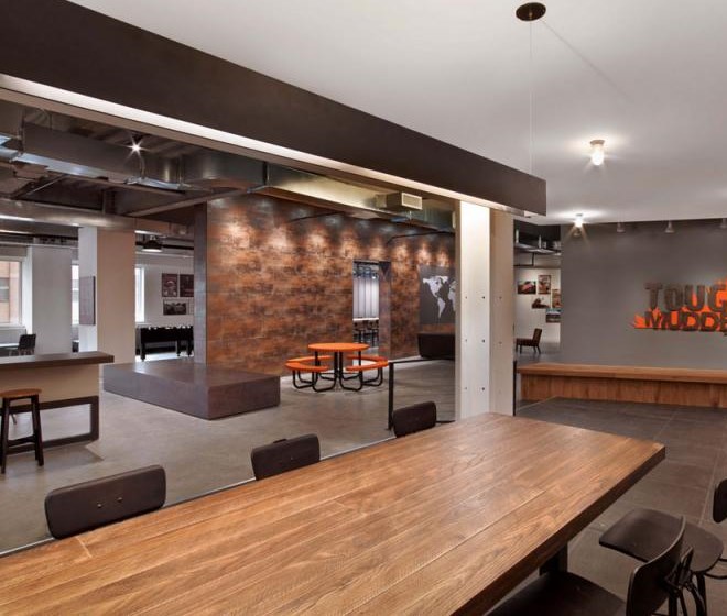 每個(gè)元素看起來(lái)都十分隨意,不過(guò)卻專(zhuān)業(yè)并且十分友好。從模仿考頓鋼的墻面到重新利用的木頭、印著Tough Mudder標(biāo)志和簽名的水泥煤渣磚會(huì)議桌。該設(shè)計(jì)提供了一個(gè)現(xiàn)代美感與工業(yè)化魅力結(jié)合的空間。
