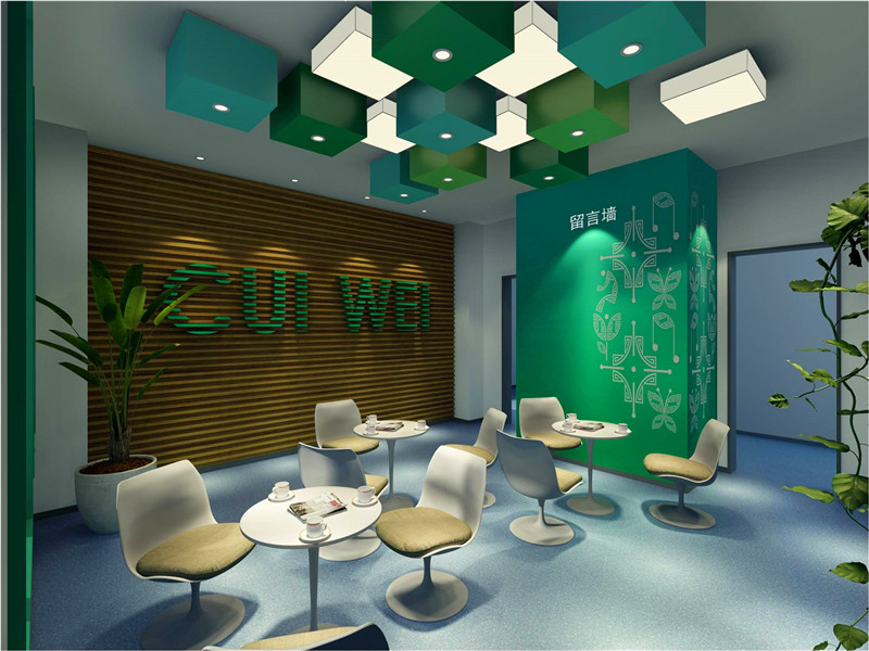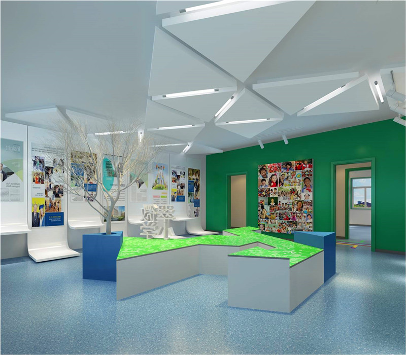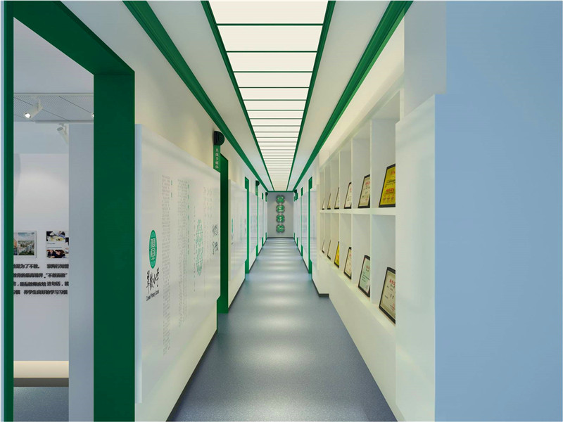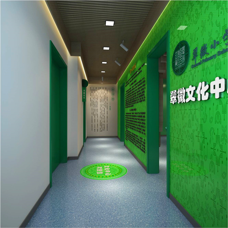 入口結(jié)合學(xué)校輔助圖形綠色墻面與翠微賦的結(jié)合及辦學(xué)特色的墻面設(shè)計(jì)直接將參觀者置于濃濃的文化氛圍中展示了教育的品牌特色。