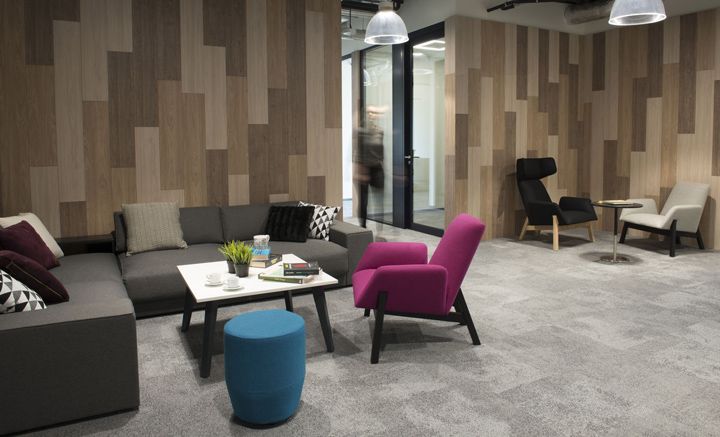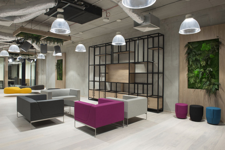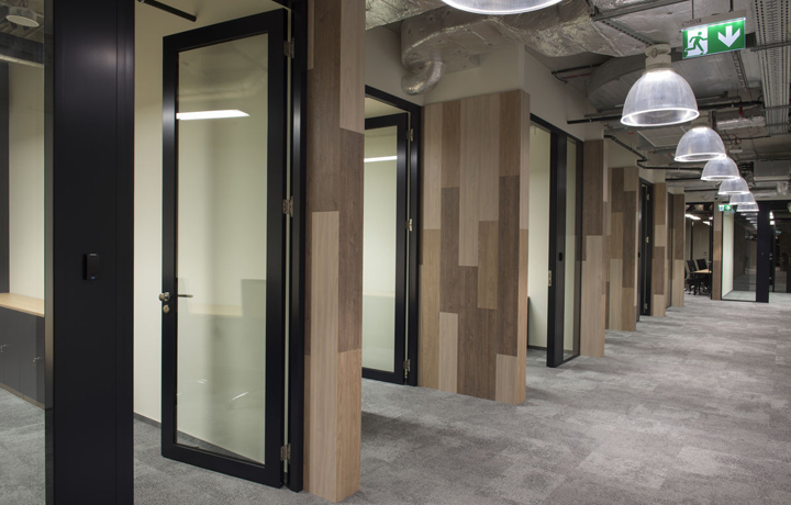開放空間和輔助空間(文印室、茶水區(qū)、付費電話會議室、電話亭等)圍繞一處大型開放的廚房咖吧而設(shè)。黑色方管制作的展示架兼具實用和裝飾性,帶來強烈的工業(yè)美學(xué)特征。