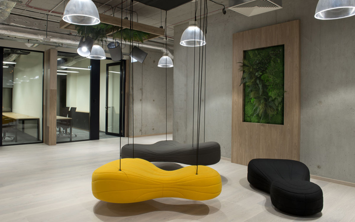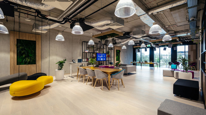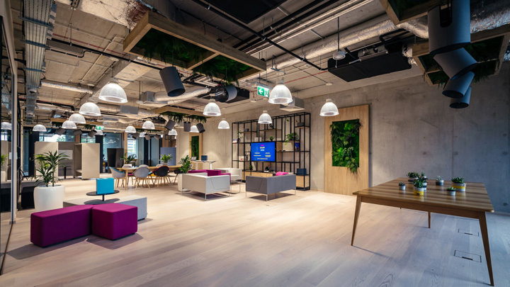 來自波蘭In Design設(shè)計團隊的作品HUBHUB極好的詮釋了這樣的理念。一樓布局更為靈動多元,這里以共享工位為主,配以會議室、咖啡吧、大型開放休閑空間。裸露的混凝土表皮配以大量溫暖的木飾面,塑造出一個溫暖的單色基調(diào)。通過時尚的家具配置和巧妙的綠植點綴創(chuàng)建一個靈動多元、促進交流分享的共享辦公空間。二樓以個人與共享的封閉辦公室為主,但隨處可見供休閑交流的公共空間。