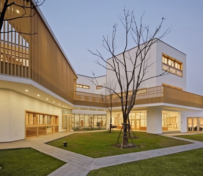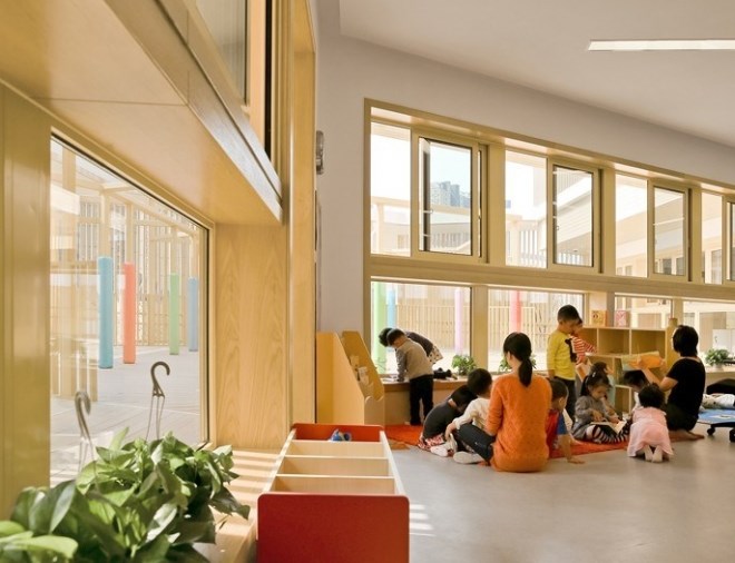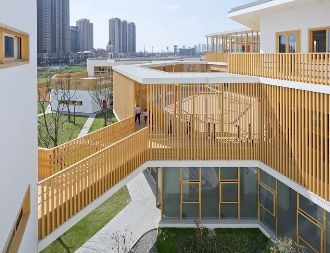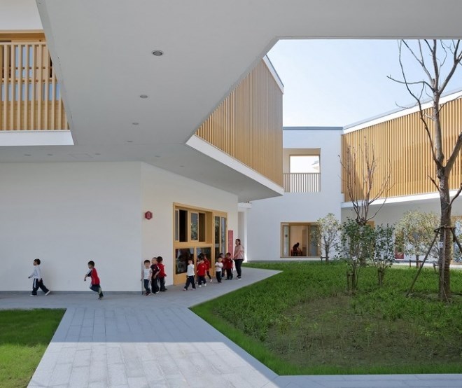 在這片7400平米的用地上,要容納15個(gè)班,6600平米三層以下的建筑以及各種室外活動(dòng)場(chǎng)地,是頗為緊張的。不過(guò),我們還是想通過(guò)這次機(jī)會(huì),為現(xiàn)代都市里的兒童設(shè)計(jì)一個(gè)有庭院的幼兒園,給他們留下關(guān)于庭院生活的情感和記憶,并通過(guò)庭院幫助他們認(rèn)識(shí)自然、認(rèn)識(shí)社會(huì)、塑造自己。