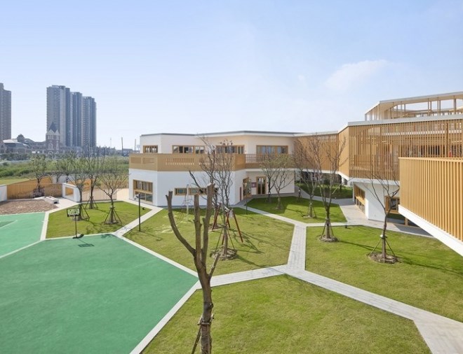 安亭位于上海西北角與蘇州花橋接壤的地方。地鐵11號(hào)線安亭站南邊正在形成一片新的生活社區(qū),社區(qū)的中心是社區(qū)教育、文化及商業(yè)設(shè)施,這座幼兒園是社區(qū)的三所學(xué)校之一,也是率先建造的公共建筑,由安亭汽車(chē)城出資,德威教育集團(tuán)(Dulwich)和華師大合辦。