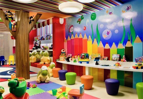 本案設計元素來源于七彩虹,整個空間以七彩為設計思路。幼兒天生就對顏色鮮艷的事物感興趣。那么,大千世界有些什么顏色呢?