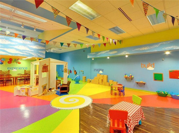 七彩世界這一主題帶領幼兒認識生活中的各種顏色,幼兒會很好奇:為什么會有紅、橙、黃、綠、青、藍、紫七種顏色呢?它們從哪里來?為了滿足幼兒急于探究的欲望,并以幼兒特定的認知方式,在裝修設計上初步地引導幼兒認識各種色彩的來源。